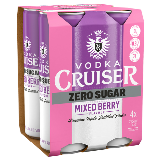CRUISERBursting with big berry flavours, smooth vodka and zero sugar – it’s all the fun, none of the guilt. Size: 275ml Standard drinks: 1 Alcohol Volume...